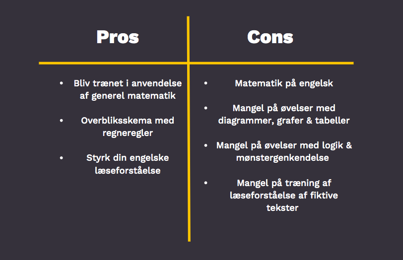 Efter en grundig sammenligning med GMAT bøgernes indhold og de krav som hhv. KU, SDU og AU stiller til deres optagelsesprøver har vi kunnet liste en række ”pros and cons” for GMAT i forbindelse med kvote 2 prøven.